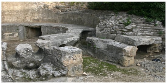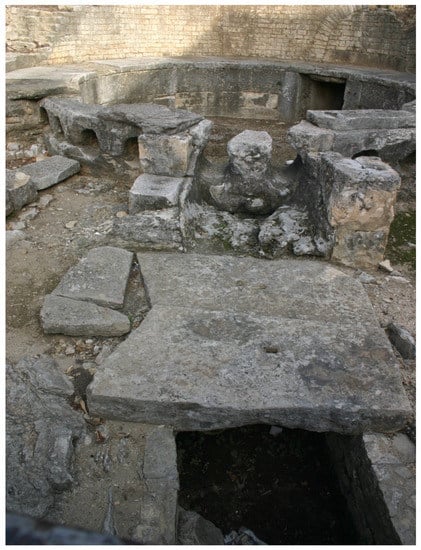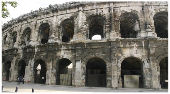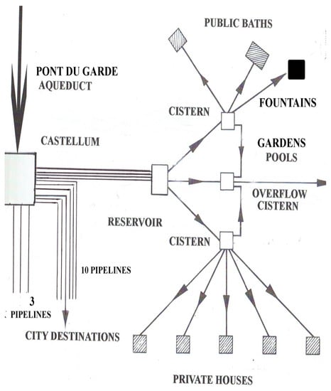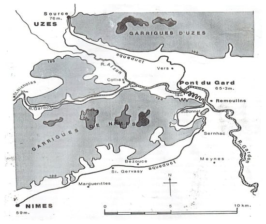 - Hauck, G.; Novak, R. Water Flow in the Castellum at Nîmes. Am. J. Archaeol. 1988, 92, 393–407. [Google Scholar] [CrossRef]