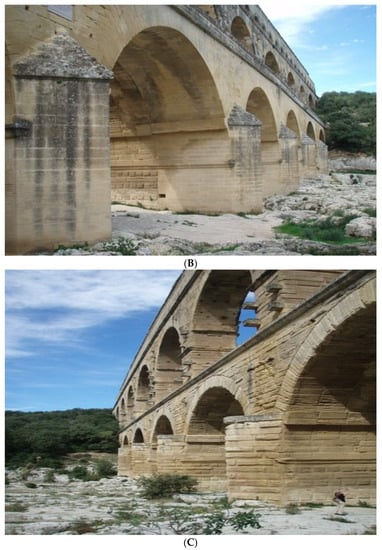 (A) The Pont du Gard aqueduct/bridge. (B) Later (1743–1747) roadway passage addition to the original Roman Aqueduct. (C) Base structure of the Aqueduct. Note foundation triangular structures to reinforce the aqueduct base and lower river water hydrodynamic pressure forces on the base structure.