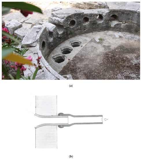 The Pont du Gard aqueduct/bridge has three tiers of arches, stands 48.8 m high and descends only 2.5 cm over its length of 274 m (a gradient of 1 in 18,241). The water channel from the Fontaine d’Eure spring source to the castellum descends by only 17 m height over its entire ~50 km length—this is indicative of the challenge in surveying precision that Roman water engineers utilized in the aqueduct design. Average slopes in meters per kilometer (and degrees per kilometer) over long sections of the channel from the Fontaine d’Eure spring at Uzès (Figure 7) to the castellum indicate mean constant slopes over long stretches of the aqueduct channel; local slope variations along channel path lengths were necessary due to local landscape surface irregularities and accuracy limits of surveyor’s instruments [1]. The water supply system may have been in use as late as the sixth century, with some parts used for significantly longer times, but lack of maintenance after the fourth century led to accumulation of channel sinter deposits that eventually limited the water flow rate [2]. Construction details (Figure 3, Figure 4 and Figure 5) of the castellum indicate 10 castellum basin wall ports from which 10 terracotta pipelines directed water to individual fountains, nymphea, baths, temples, gardens, theaters, commercial sector and administrative buildings, private homes and intermediate reservoirs around the city. Three pipeline ports (Figure 6) on the floor of the castellum basin served for adjustable basin drainage, flow diversion during repairs and cleaning of the castellum and, when partially opened by movable cover plates, served as an adjustment mechanism to guarantee that the ~40,000 m3/day aqueduct delivery rate closely matched the design output flow rate from the 10 basin wall pipelines.