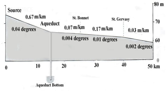 The Fontaine d’Eure spring, at 76 m above sea level, is 17 m higher than the castellum above the city of Nemausus; this provided sufficient gradient to sustain gravity flow of aqueduct water to Neamausus. The aqueduct’s average gradient is ~1/3000 but the local channel slope varies widely along its course [2,3] being as small as ~1/20,000 in some sections (Figure 7). The average gradient between the start and end of the aqueduct (0.34 m/km) is far shallower than usual for Roman aqueducts being only approximately one-tenth of the average gradient of some of the eleven aqueducts supplying Rome. The reason for the change in gradients along the water system’s route is that a uniform gradient would have meant that the Pont du Gard aqueduct/bridge would have an extreme height and thus present a formidable construction challenge given the limitations of Roman construction technology. By maintaining a steeper gradient along the channel path ahead of the aqueduct/bridge (Figure 7), Roman engineers were able to lower the height of the aqueduct/bridge by 6 m to a total height of 48.7 m above the Gardon River bed. This height limit governed both the up- and downstream channel gradients of the aqueduct as well as limiting the weight of the aqueduct. Despite the weight saving design, the substantial as-constructed weight of the multi-tiered stonework created a slight depression in the middle of the aqueduct/bridge that created a slightly increased water depth in the center of the aqueduct channel. The initial gradient profile originating from the spring source before the aqueduct/bridge is relatively steep descending 0.67 m/km but descends by only 6 m over the remaining channel length to the castellum (Figure 7). In one channel section, the winding route between the Pont du Gard aqueduct/bridge and St. Bonnet (Figure 1) required an extraordinary degree of accuracy from Roman engineers who had to survey for a channel decline of only 7 mm per 100 m of the aqueduct.