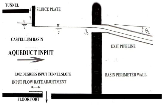 The critical, partial flow entry velocity for 10 pipes is Vc = (g yc)1/2 = 4.01 ft/s and 5.8 ft/s for the 13 ports open case. The Froude number is Fr10 ≈ 1 for the 10 port open case and Fr13 ≈ 1.3 for the 13 port open case. The important conclusion is that wall port entry Froude numbers are either near critical (Fr ≈ 1) or slightly supercritical (Fr > 1). Again, the importance of this design feature, as regulated by the sluice gate height position (Figure 12), is that with critical (Fr = 1) and near supercritical (Fr ≈ 1) entry port flows that continue critical (or near critical) in pipelines, this eliminates downstream resistance influence that may induce upstream flow instabilities and destabilize the input flow rates to the pipeline ports. This positive effect is induced with smooth interior wall pipelines with little if any connection joint roughness—an option likely available for optimum water transfer flow conditions to the city. This is a most important design feature of the actual castellum and its sluice gate regulation mechanism. In modern hydraulic terminology, upstream influence derived from downstream resistance obstacles does not occur for Fr = 1 critical or Fr > 1 supercritical flows [10,15,16,17,18,19]. The θc angle (Figure 10) is derived from the Manning equation [19] where n is an empirical resistance constant indicative of a likely worst case internal pipeline wall roughness (given here as n = 0.034) and connection joint roughness accumulated from the thousands of piping connection sections of ~0.5 m length that comprise long pipelines from the castellum to destination sites. Here Rh is the hydraulic radius given by the cross-sectional area of the critical flow (Ac) divided by its wetted perimeter. The critical pipeline angle θc is given by: