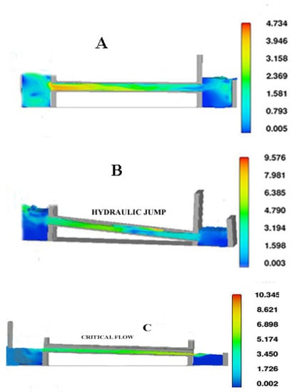 As critical pipeline slope configurations are observed as having flow stability and high flow rate benefits, the next task is to examine both critical and off-design, non-critical pipeline slopes that may occur if destination sites mandate higher or lower pipeline slopes to reach. As different pipeline slopes yield different flow rates, the task ahead is to determine what slope choices associated with different destination uses produce flow rates to match the 40,000 m3/day input aqueduct flow rate. Three possible pipeline configurations (A, B, C) determined by their slopes originating from the castellum basin wall are examined using FLOW-3D Computational Fluid Dynamics [20] CFD models (Figure 9). The use criteria involving different pipeline slopes are determined by computing the output flow rate (Table 1) from all 10 pipelines configured at different A, B or C slopes to determine whether the total output flow rate is lower, matches, or exceeds the input aqueduct flow rate.