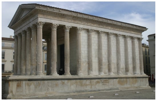 The second figure (Case B, Figure 9) represents pipeline slopes exceeding the optimum pipeline critical slope. Pipelines at these slopes are consistent with the height difference and the distance between the castellum and some of the nearby flat areas of present day Nîmes that once held the streets of Nemausus. Initial entry port flow is full subcritical flow and, at a downstream location, partial supercritical flow develops in the pipeline until a hydraulic jump (HJ) occurs due to large internal pipeline friction effects at high water velocity converting supercritical partial (Fr > 1) flow to subcritical (Fr < 1) full flow. As Figure 9, Case B indicates. A smooth internal pipeline wall would delay the appearance of a hydraulic jump but for the present example case, very rough pipeline internal walls and connection joints are assumed (for smooth wall roughness, θc values would decrease). For significant internal wall roughness, an internal hydraulic jump is created isolating a partial vacuum region between full entry and post-hydraulic jump flow regions as previously noted. If openings were placed along piping top regions over the partial vacuum region, then a stable flow rate would be enhanced. Again, as no extant pipelines exist, the presence of pipeline top openings is conjectural but well within Roman technology as observed on Ephesus pipelines and the Laeodocian site [3,4,15]. Pipeline designs with Case B flow characteristics without a terminal stilling basin would be devoted to lower priority sites that do not require a stable water delivery rate such as gardens, reservoirs, latrine flushing channels and intermittent household use. Other uses may include pipeline water transfer to fountain houses that have multiple chambers supporting different hydrostatic head values [4] to transfer water at different flow rates to different destinations; such terminal fountain houses were likely part of a city flow network. Figure 10 and Figure 11 show typical Roman flow destinations still existing in present day Nîmes served by one or more of the castellum’s 10 pipelines. The Maison Carré Roman Temple to Apollo (Figure 11) constructed in the period 10–16 BC required a later water supply addition for ritual and ceremonial purposes; the second century AD Roman amphitheater (Figure 12) also required ample water supply for large public gatherings for events and spectacles and likely required the output of several of the castellum pipelines for this purpose. This could be accomplished by water storage in lower reservoirs elevated above the amphitheater level with suitable valve systems to control the flow rate to drinking fountains and water basins within and adjacent to the amphitheater.