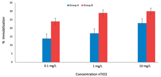 It was clear that nTiO2 concentrations were harmful to D. magna, as in previous works when D. magna was exposed to nTiO2 [25,26,27]. Figure 1 shows that the immobilization ratio was 24% when D. magna was exposed to nTiO2 (group A), still, when this organism was exposed to both nTiO2 and SSR (group B) immobilization ratio was low, 30%, suggesting a joined effect.