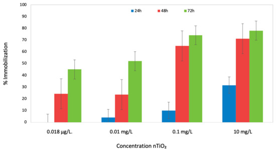 At the first 24 h of exposure, we observed that at 0.1 and 1 mg/L nTiO2, the immobilization was <20%. Still, at 10 mg/L the immobilization increased to 42%, and at the highest concentration, 100 mg/L, 75% of the individuals were immobile. Under these experimental conditions, the estimated EC50 was 12.98 mg/L.