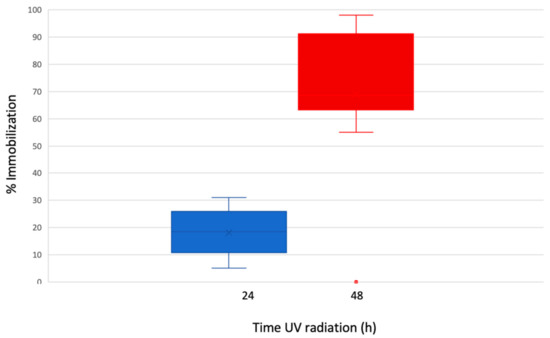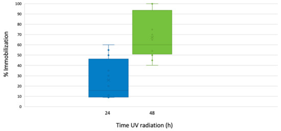 Then, after 48 h of UV radiation, a notable increase of the immobilization was observed (Figure 5), at 0.1 mg/L was 55%. At 1 and 10 mg/L nTiO2 concentrations, the immobilization remained <80%, but almost 98% immobility was registered at 100 mg/L, corresponding to a EC50 value of 7.60 mg/L.