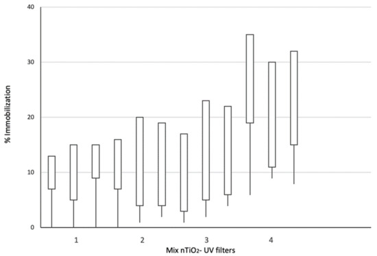 - Exposure to irradiation, nTiO2, and a mixture of organic UV filters, a notorious increment of the immobilization rate was observed.