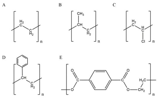 Chemical structures of: (A) polyethylene, (B) polypropylene, (C) polyvinyl-chloride, (D) polystyrene, and (E) polyethylene terephthalate.
