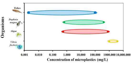 MPs toxicological effects on freshwater aquatic (micro)organisms are still scarce since most studies applied marine (micro)organisms. Therefore, future studies should be focused on freshwater microorganisms such as algae and bacteria or other surface water and sediment organisms. Current data summarized in Table 3 reveal that researches are performed using a wide range of concentrations and types of MPs to study adverse effects to the range of organisms (from bacteria to fish). Accordingly, the graphical presentation in Figure 3 shows the range of ecotoxicological concentrations established for different organism levels studied, thus providing an insight into the sensitivity of tested organisms to changes in MPs concentrations affecting different trophic levels.