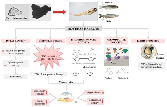 One of the freshwater organisms often used in ecotoxicological studies is zebrafish Danio rerio (D. rerio). It has been proven that MPs can cause morphological deformations of D. rerio [125], as well as the changes of nervous (acetylcholinesterase activity, AChE), visual [124] and immune system [142], oxidative stress (Reactive Oxygen Species –ROS) [125], reproductive toxicity [143], and damage of intestine [123], as shown in Figure 5.