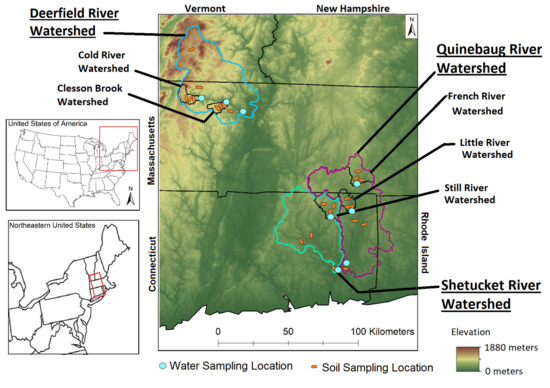 This study focused on three main watersheds, the montane, sparsely populated Deerfield watershed in western Massachusetts and the lowland, urbanized Shetucket and Quinebaug watersheds in eastern Connecticut. The Deerfield Watershed lies in northwestern Massachusetts (Figure 1). The climate in the Deerfield watershed is humid continental, with mild summers and precipitation throughout the year (Dfb) using the Köppen climate classification. The climates in the Shetucket and Quinebaug watersheds are borderline Dfb and Dfa, which is humid continental, with hot summers and precipitation throughout the year in the Köppen climate classification.