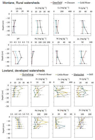 Upland soil pits showed some differences among the Deerfield, Quinebaug, and Shetucket watersheds. Using the Kruskal–Wallis test with post hoc Wilcoxon Signed Rank test, overall soil As concentrations were not significantly different within the three watersheds. Soil Cu concentrations were greater at developed Quinebaug and Shetucket watersheds than in the montane Deerfield (p < 0.05; Figure 2) across all soil depths. Further, overall soil Cu concentrations in the Little and French subwatersheds were higher than Clesson, and Cold watersheds (p < 0.05; Figure 2). Overall soil Fe concentrations were higher in the montane Deerfield watersheds than in the lowland Quinebaug watersheds (p < 0.05; Figure 2). Further, overall soil Fe concentrations were higher in Clesson and Cold watersheds than the French and Little subwatersheds (p < 0.05; Figure 2). Overall soil Ni concentrations were not significantly different among the three watersheds, but surface soils at Little and Shetucket watersheds were higher than in all of the Deerfield watershed (p < 0.05; Figure 2). Soil Pb concentrations were significantly higher throughout the more developed Quinebaug and Shetucket watersheds than in the Deerfield watershed (p < 0.05; Figure 2). Due the wide variability in soil Zn concentrations, there were no significant differences among the three watersheds. Overall soil LOI concentrations varied widely among the watersheds but was not significantly different among the three watersheds. Soil LOI was lowest in the Clesson (2 to 7%) and French (5 to 10%) subwatersheds and highest in the Little (15 to 27%) subwatershed. Overall soil pH was significantly higher in the Deerfield watershed (pH 4.0 to 6.0) compared to Quinebaug (pH 4.2 to 4.7) and Shetucket (pH 3.9 to 4.5) watersheds.