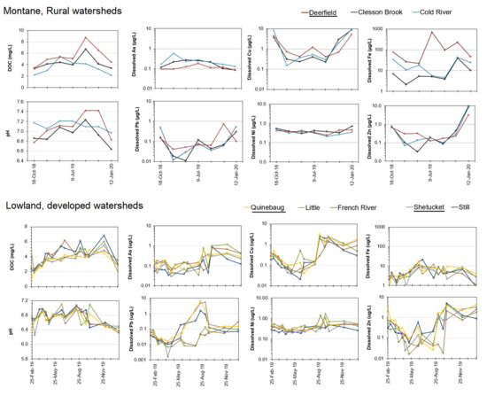 River water pH, DOC, and dissolved trace element concentrations in the montane, Deerfield watersheds of northwestern Massachusetts and in the lowland, Quinebaug and Shetucket watersheds of eastern Connecticut. Please note the different collection dates and linear scale for DOC. River water samples were filtered to < 0.45 µm.