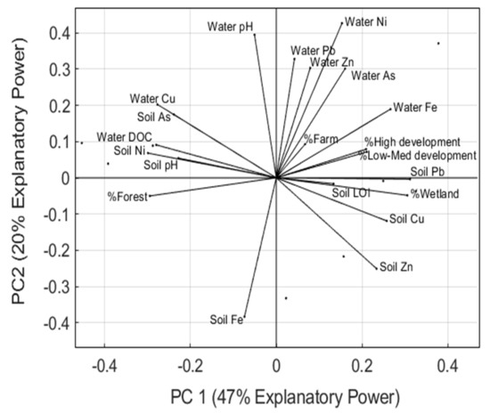 Lastly, the variance in watershed data was examined using a principal component analysis of median trace element soil concentrations, normalized dissolved trace element exports, and land use across the watersheds. The results show that soil Pb concentrations, wetland%, high development%, low–medium development%, soil Cu and soil Zn drive the positive variance in PC1 while forest%, soil As, Ni, dissolved Cu and Fe export drive the negative variance in PC1. Furthermore, dissolved Zn, Pb, Ni, and As, drive the positive variance in the PC2 while Soil Fe, and Zn drive the negative variance in PC2. (Table 5).