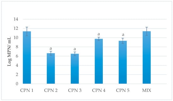 Abundance of hydrocarbons degraders, evaluated by the most-probable number (MPN) method, in the cultures inoculated with the bacterial strains isolated from a beach sediment, both as individual bacterial strains (CPN1, CPN2, CPN3, CPN4, CPN5) and as a mixture of the 5 bacterial strains (MIX) (mean values, standard deviations, n = 3). a—significant differences compared with the MIX (p < 0.05).