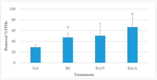 For each treatment, the percentage of TPHs removal was also evaluated (Figure 5). The results revealed that the biostimulation (BS) and bioaugmentation (BA/P and BA/A) treatments showed higher TPHs removal percentages than natural attenuation (NA). Although no significant differences were observed between the treatments BS, BA/P and BA/A, the latter, in which the consortium was pre-grown with sodium acetate, showed the highest removal percentage of TPHs (66%).