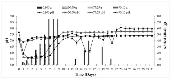 As can be seen, initially (first two days) there is a decrease in the pH value for all reactors. However, for the 90:10 and 75:25 mixtures, the drop in pH was lower due to the buffering capacity provided by the CM.