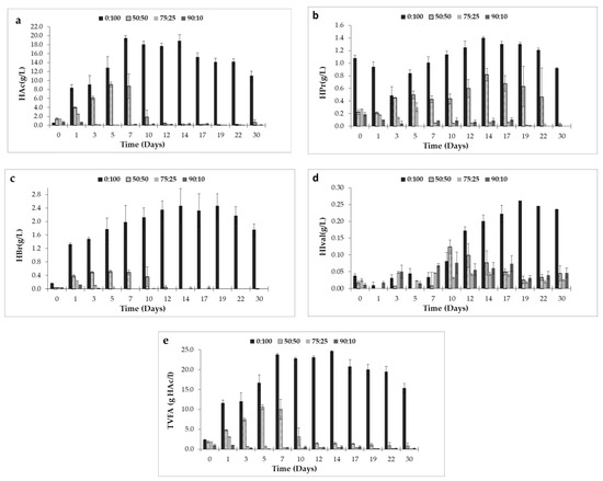 The trend for each of the individual VFAs is very similar to that observed for total acidity in each test. In Figure 2, it can be seen that the highest production and accumulation of volatile acids took place for the 0:100 assay.