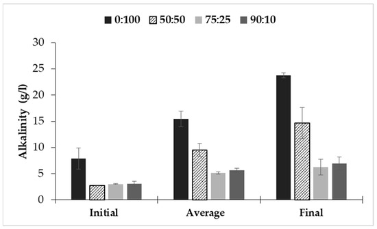Alkalinity is a variable of great importance for the stability of the anaerobic digestion process. A high value of alkalinity allows the system to be able to absorb the production of VFAs, without producing sharp drops in pH. In general, operating at thermophilic range (55 °C) a higher alkalinity value is required to maintain the stability of the process and to avoid the acidification caused by the production of VFAs. This fact is related to the increase in hydrolysis and acidogenesis rates when operating in the thermophilic range. Figure 3 shows the initial, average, and final alkalinity data for the different co-digestion mixtures.