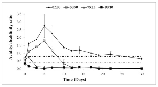 The relationship between the total content of VFAs and the alkalinity shows a different trend for the different mixtures tested. Thus, in Figure 4 it can be observed that, as the percentage of CM in the mixtures increases, the maximum value reached in the Acidity/Alkalinity ratio decreases. Zhao and Viraraghavan [35] reported that if the acidity/alkalinity ratio exceeds 0.8, the pH drops sharply followed by a clear inhibition in methane production and the process fails. Increases above 0.3–0.4 indicate a system failure and the need for a corrective action. A suitable ratio is considered to be between 0.1 and 0.2.