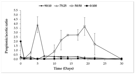 Figure 5 shows the evolution of the propionic/acetic of the studied mixtures.