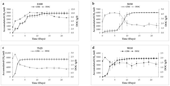 Comparison of the Dissolved Organic Carbon (DOC) and methane accumulation evolutions in the studied mixtures. (a): 0:100 mixture ratio; (b): 50:50 mixture ratio; (c): 75:25 mixture ratio; (d): 90:10 mixture ratio.
