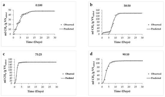 In a co-digestion study of by-products of sugar beet (SBB) and cattle manure (cow and pig), they report that in reactors fed only with SBB, the lag phase increases as the percentage of TS increases [42]. The 75:25 mixture presented the maximum rate of CH4 production compared to the other mixtures studied, this mixture has a C:N ratio of 16.85. Figure 7 shows the prediction values of the model and the experimental values.