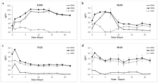 Evolution of dissolved acid carbon (DAC), dissolved organic carbon (DOC), and carbon as acid substrate (ASC) parameters. (a): 0:100 mixture ratio; (b): 50:50 mixture ratio; (c): 75:25 mixture ratio; (d): 90:10 mixture ratio.