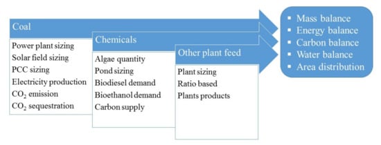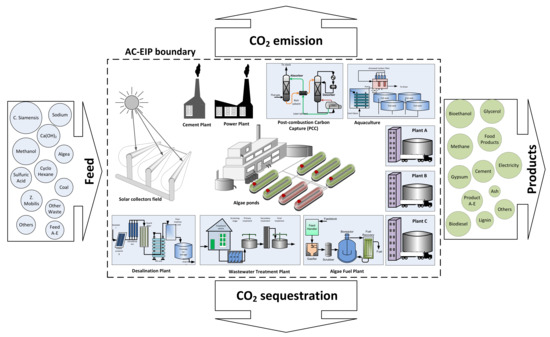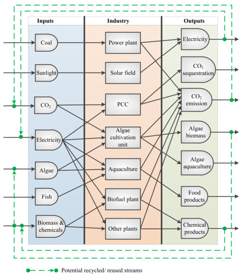 In the power production industry, fossil fuel-fired power plants have historically been positioned near major material resources, such as locations that provide access to coal and water. For future renewable energy systems however, they are more scalable and can flexibly operate in decentralized mode. The need to minimize carbon emissions and comply with more stringent controls on other environmental pollutants means that the renewable energy systems have the potential to adapt an EIP approach and may prove a stronger determinant of their locations. In establishing an EIP, potential byproduct exchanges and process integrations need systematic and quantitative modelling to validate the sustainable and systemic benefits for involved industries. Many uncertainties hovering around large-scale algae cultivation unit (ACU) viability and the downstream processing of algae, water and land usage, stabilized production technology, market forces and government policies on alternative energy and carbon credits [32]. However, only few studies seem to have presented such models to demonstrate tangible energy and material savings and those that demonstrate pollution reduction benefits are particularly rare [15,33,34,35,36,37,38]. The absence of such studies becomes apparent when compared with broader literature on EIPs, covering qualitative approaches that target social, cultural, and business factors, aimed at aiding the development of associated policies and planning prospects [11,39,40,41,42]. A detailed and quantitative model of the potential material and energy exchanges in a proposed EIP would enable the following advantages: