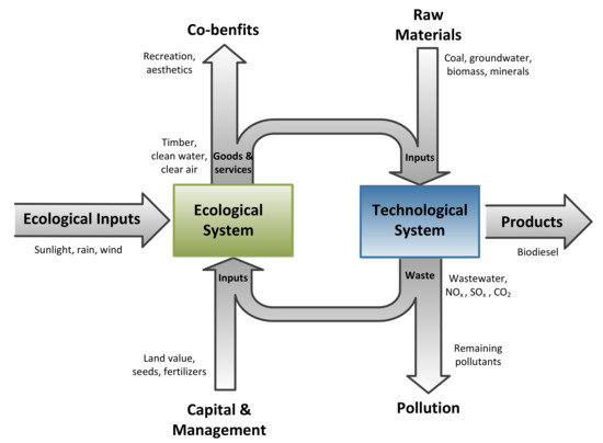 The use of algae in this eco-industrial park design reflects on the recent ideas of Bakshi et al. [13] in their proposed TES (Figure 2). Algae culture resembles the role of the natural ecological system to a great extent, although, with a minor environmental footprint caused by establishing the infrastructure in the form of ponds, photo-bioreactors, pumps, piping, etc. The ACU often operates at low temperatures to uptake and biologically process materials excreted by the technological system. At the same time, the algae process provides services, for example, capturing CO2, treating wastewater, and generates a myriad of possible products, such as aquaculture feed, biofuels, lipids, and nutraceuticals.
