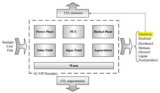 A conceptual case study has been developed to demonstrate the potential of this modelling framework for the conceptual design of EIPs using material and energy flow analysis. This is illustrated in Figure 6, where the AC-EIP boundary is drawn around a power plant, a solar field, PCC, algae pond, biofuel plant, and aquaculture.