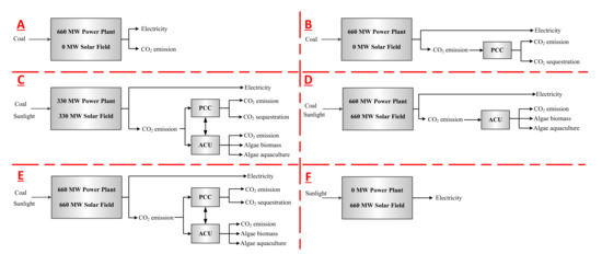 The fifth scenario (scenario ‘E’) also integrates the AC-EIP into a 660 MW coal-fired power plant and an equivalent solar plant (660 MW), but with the addition of PCC. Similar to scenario ‘D’, the total power attained in scenario ‘E’ also doubled to 1320 MW; hence, it is called the power-boosting scenario (PBS). As in scenario ‘C’, the amount of CO2 not consumed by the ACU is captured and sequestered in the CCS process (Figure 7E).