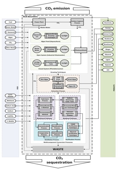 The overall AC-EIP calculation is carried out within a framework based on a mathematical model illustrated in Figure 5. The main purpose of this integrated framework is to comprise all the data of the overall process flow chart and make multiple outputs for the purpose of optimizing the EIP, where algae processing is in the center. As Figure 3 suggests, we identified those products and by-products that can be recycled back within the boundary (i.e., CO2, electricity, and algae biomass) to feed other industries.