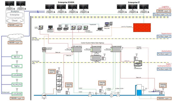 According to the Smart Water Networks Forum (SWAN) [], a global non-profit hub consisting of international water companies, academics, regulators, and other water experts, smart water networks are the “entire system of data technologies connected to or serving the water distribution network [and] it is informative to separate its components into layers.” These layers [] are similar to those found in Purdue reference model, as indicated in Figure 1: