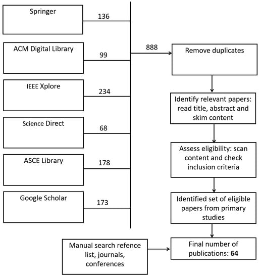 Online database searching resulted in 888 publications, and details of these were exported into a CSV file for further processing. After removing any duplicates, the remaining peer-reviewed publications published in internationally recognised conferences, workshops or journals were selected for further inspection. Selection of the eligible list of publications for analysis was based on inclusion and exclusion criteria by inspecting title and abstract, and text skimming. As a result, a set of 64 publications was finalised for analysis to answer the research questions.