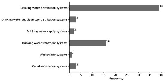 Figure 5 shows the application domains of the security studies. The majority of studies were carried out on drinking water systems: 39 studies focused on security of water distribution systems (WDS) including water distribution networks; 3 studies included water supply and distribution systems; and 2 studies focused on water supply systems. Another 16 studies investigated security of drinking water treatment systems. Only four studies focused on non-drinking water systems: 3 studies focused on canal automation systems used for irrigation; and one study covered wastewater systems. There is a clear imbalance between studies covering water systems designed to provide drinking water versus those designed for other forms of water.