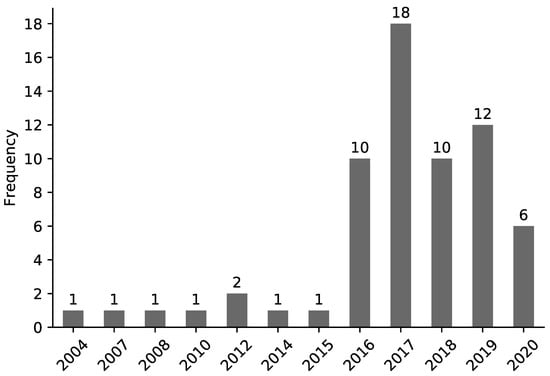 Figure 6 shows the timeline of publication. The earliest publication found dates from 2004, but most of the research effort (56 papers) was published after 2015. Answering RQ1, there has been increasing interest in the security of water systems over the years, likely as a result of the emergence of new resources and corresponding effort that made use of them.