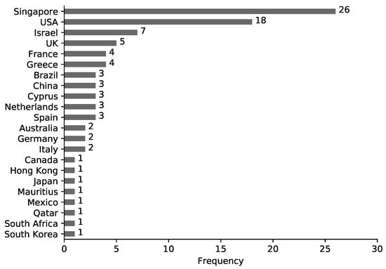 Figure 7 shows the distribution of studies per country based on the location of the authors. If the authors of the publication were located in multiple countries, for example several authors from Singapore and one author from Israel, both countries were added to the statistics. Figure 7 provides an answer to RQ2 indicating that most of the existing research has been carried out by authors in countries that have made investments in this area: Singapore and their collaborators (Israel, USA) and countries involved in projects funded by the EC.