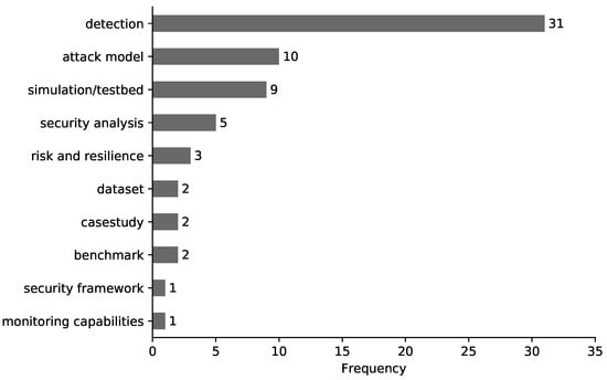 Existing studies were categorised into the following areas: testbeds, simulation and datasets; cyber-attack models; cyber-attacks detection models; model-based security analysis; risk and resilience management; security frameworks; and security benchmarks and case studies. These categories help to answer RQ6, showing type of research contributions.