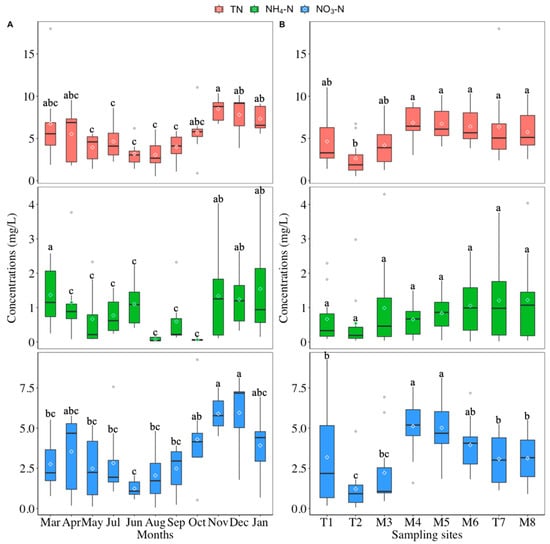 The temporal (A) and spatial (B) variations in concentrations of TN, NH4+-N and NO3−-N in eight sites in the Yuntaishan River basin. Letters on boxes represent statistical significance, and different letters and same letters indicate difference between these two boxes is significant (p < 0.05) and insignificant (p > 0.05) based on an ANOVA, respectively. Each month in (A) is an average of all stations, and each sampling site in (B) means the yearly average.