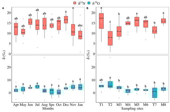 The temporal (A) and spatial (B) variation in δ15N-NO3 and δ18O-NO3 in eight sites in the Yuntaishan River basin. Letters on boxes represent statistical significance, and different letters and same letters indicate difference between these two boxes is significant (p < 0.05) and insignificant (p > 0.05) based on an ANOVA, respectively. Each month in (A) is an average of all stations, and each sampling site in (B) means the yearly average.
