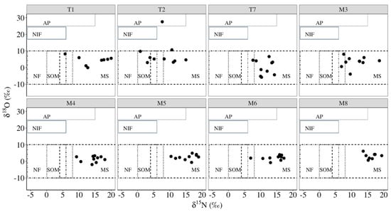 According to previous research in the region, the nitrate sources include chemical fertilizers, atmospheric deposition, manure and sewage and nitrogen in soil organic matter in surface water and groundwater []. Similar to many studies [,,], this research mainly focused on the contributions of non-point source pollution to nitrate in rivers. Although groundwater may also contribute the nitrate pollution in the river, to the best of our knowledge, the contribution is very small in our research area [,,]. In addition, because none of the samples fell within the range of NO3− in fertilizer (NIF), NIF was not applied as a source for the calculation. Studies have shown that the δ15N-NO3 value in domestic sewage was lower than that in manure, with the range of 4–19‰ []. There was no obvious manure source in the study region, such as large animal breeding sites, and δ15N-NO3 values of most samples were below 19‰. In addition, to the best of our knowledge of this area, there were no significant differences between the untreated sewage and treated sewage. In particular, δ15N-NO3 and δ18O-NO3 in WWTPs were 13.88 ± 5.86‰ and 2.34 ± 3.39‰ [], respectively, which were close to the values in raw sewage (11.4 ± 2.3‰ and 2.5 ± 2.2‰) []. Therefore, domestic sewage was considered as the main source of the NO3−-N in our study area. Due to the small difference between raw sewage and treated sewage in the area, we used values of raw sewage for all sewages in the current study. Therefore, there are four potential NO3−-N sources in the water environment: sewage (MS), nitrogen in soil organic matter (SOM), NH4+ in fertilizer (NF) and atmospheric precipitation (AP) [,]. The ranges of nitrate isotopic composition from potential sources have been well testified in previous publications [,,]. Similar to many studies, this research referred to published values from similar research areas (Table 3). Based on the differences in δ15N-NO3 and δ18O-NO3 values among the four potential sources, this study adopted the dual-isotope bi-plot approach (δ15N-NO3 versus δ18O-NO3) to identify the dominant sources of NO3−-N in the research sites []. The scattered points (δ15N-NO3 versus δ18O-NO3) of the samples fell within a single or overlapping area of the NO3−-N source frame, suggesting that the NO3−-N derives from this source (the single area) or the corresponding multiple sources (overlapping areas).