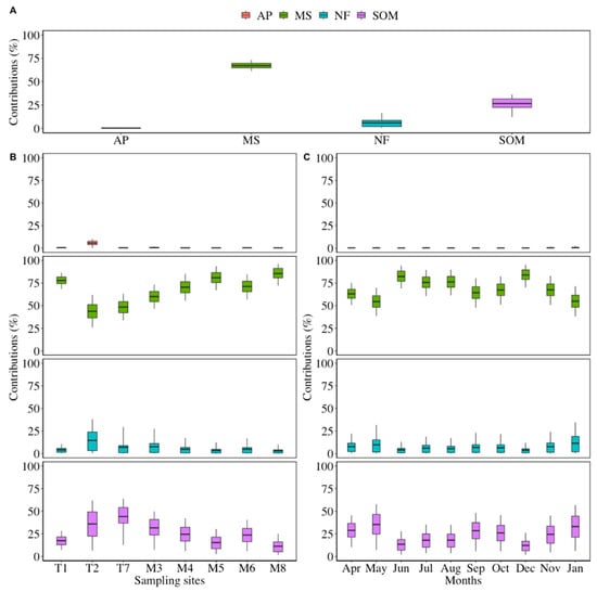 Fractional contributions of different sources to NO3−-N in Yuntaishan River basin. (A) Contributions from four main sources; (B) contributions in eight sampling sites; (C) contributions indifferent months. AP is atmospheric precipitation; MS is manure and sewage; NF is NH4+ in fertilizer; SOM is nitrogen in soil organic matter. The data in the table show the mean contributions of different sources. The line within the box represents the mean values. The box spans the 0.25 and 0.75 quantiles, and the whiskers represent the 0.05 and 0.95 quantiles.