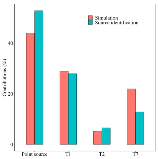 Contributions of tributaries (T1, T2 and T7) and point source to NO3−-N in the outlet of Yuntaishan River. Simulation was conducted based on the mass balance.