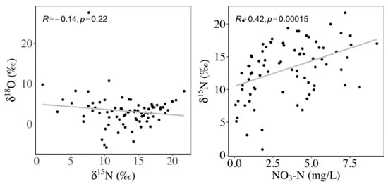 As an important process of nitrate removal in rivers, denitrification can cause isotopic fractionations during nitrogen cycling and change the isotope composition of nitrate, resulting in deviation in the identification of nitrate sources [,]. During the denitrification process, NO3− is finally reduced to N2. The lighter 14N isotope is incorporated in this process, resulting in an increase of δ15N in the residual NO3−-N []. Studies have shown that the δ15N-NO3 has a positive linear correlation with the δ18O-NO3 and a negative correlation with the concentration of NO3−-N when denitrification exists [,]. In the present study, the δ15N-NO3 value exhibited insignificant positive correlation with the δ18O-NO3 value (p > 0.05) but a significantly positive correlation with the NO3−-N concentration (p < 0.05) (Figure 7). In addition, the dissolved oxygen (DO) concentration in natural rivers is generally higher than that required for denitrification (DO < 2.0 mg/L) [,]. Therefore, all the evidence indicates the absence of denitrification processes in our study region; this is consistent with the results from rivers in the Changle River catchment, Panzhuang Irrigation District, and Taihu Lake Basin in China [,,]. Nitrate from nitrification of ammonium nitrogen in soil, chemical fertilizer and manure had δ18O-NO3 values ranging from −10‰ to 10‰ [], with one exception. Therefore, NO3−-N was mainly from nitrification of ammonium in our research region, which was consistent with the results obtained in other agricultural areas [,,].