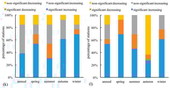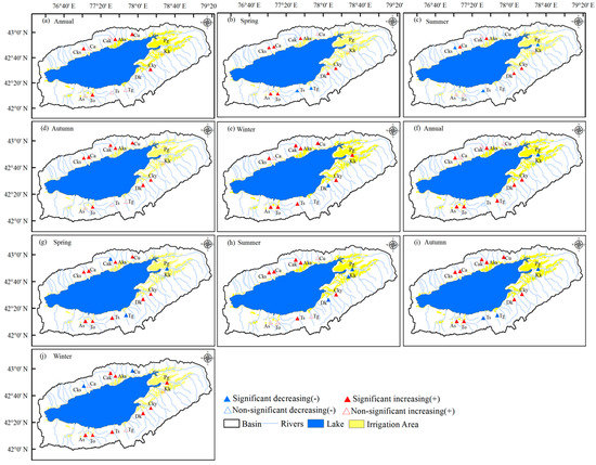 - According to the temporal distribution of the MK test, significantly increasing (decreasing) trends were observed in 5 (0), 6 (2), 4 (3), 8 (0), and 8 (1) time series in annual, spring, summer, autumn, and winter river runoff data. At the same time, the ITA method detected significant trends in 7 (1), 9 (3), 6(3), 9 (3), and 8 (2) time series in the study area. The comparison results revealed that the ITA method could effectively identify the trends detected by the MK trend test.