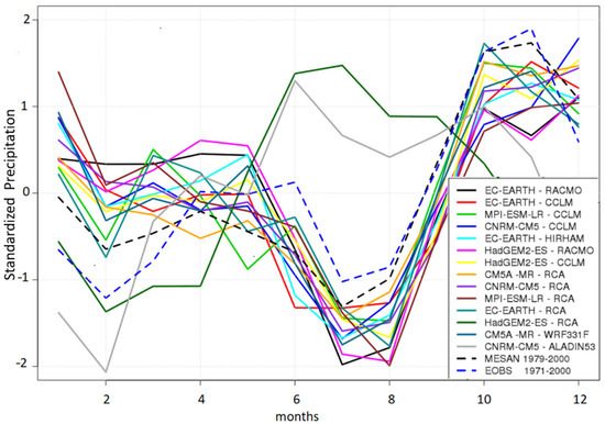 Seasonal cycle of precipitation according to the 14 Euro–CORDEX simulations (colored lines) in comparison with E-OBS and MESAN data (blue and black dashed lines, respectively), calculated for the period 1971–2000 (MESAN data refer to the 1979–2000 years) [31].