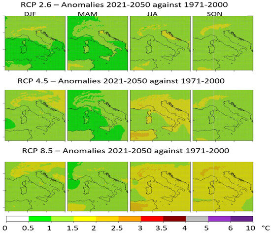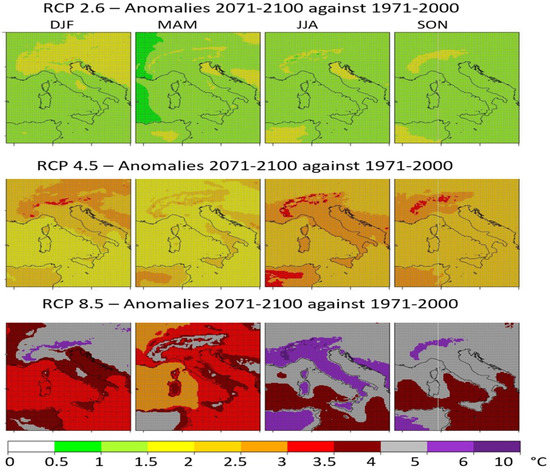 Climate change scenarios are presented in terms of seasonal anomalies, i.e., by considering the differences between the climate future values and the reference ones in the four seasons: winter (DJF), spring (MAM), summer (JJA) and autumn (SON).