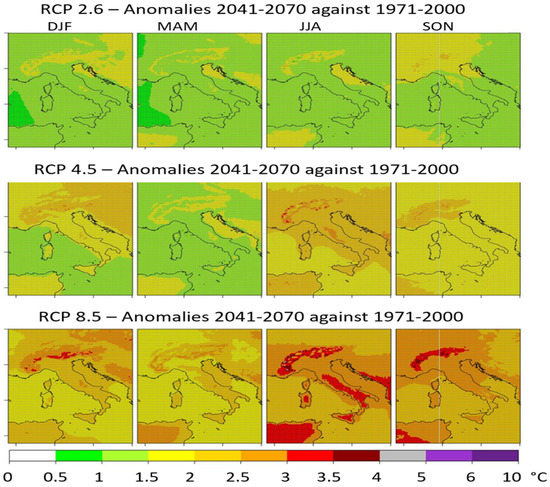 Because of the uncertainty regarding future anthropogenic emissions, as well as future land-use changes, future climate projections were elaborated using model simulations realized under three different hypothesis of radiative forcing; each provides a plausible description of how the future may evolve with respect to a number of variables, including socio-economic change, technological change, energy and land use, greenhouse gas emissions and air pollutants [32]: RCP 8.5 should be seen as very high baseline emission scenario (business-as-usual scenario), RCP 4.5 can be interpreted as an intermediate mitigation scenario, while RCP 2.6 is representative of a mitigation scenario leading to a very low forcing level.