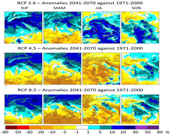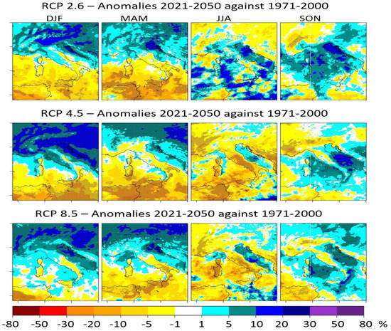 In the coming decades (Figure 6), a significant precipitation reduction is expected in summer and spring (in this case, only Southern Italy is affected) with values ranging between 5 and 10% depending on the emission scenario. In the other seasons, no significant signals are evident.